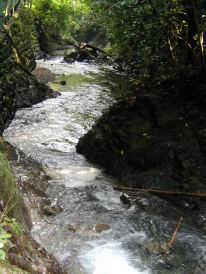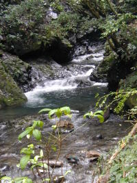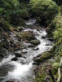 ここが清水とは思えない渓流沿いの道を歩いていくと、行き止まりに
